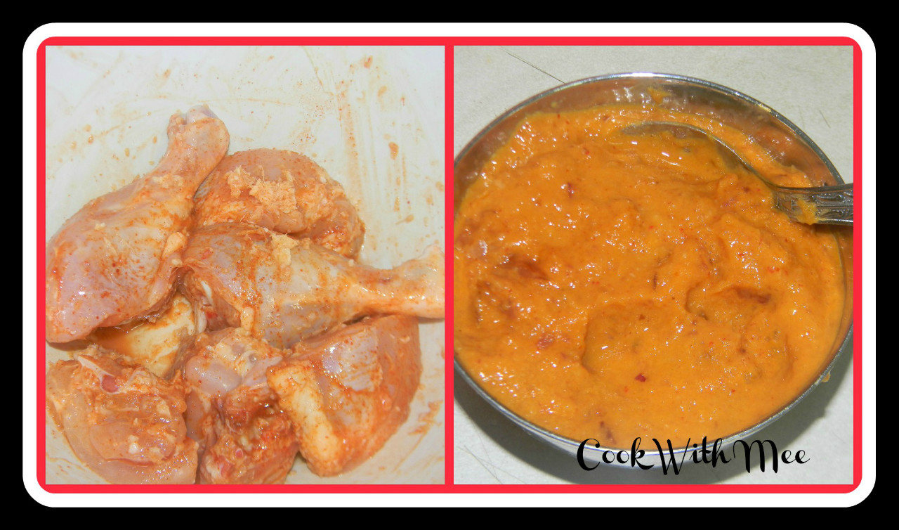Marinate the chicken pieces with lime juice, half tea spoon of red chili powder, half tea spoon of black pepper powder, ginger- garlic paste and some salt for 1 hr.